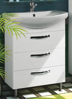 Тумба в комплекте с раковиной "Ария 65 Н" Комплектация: Ручки – 3 ящики из ВДСП «дуб молочный» – 3 шариковые направляющие навесы – 2 ножки – 2 Дополнительная информация: Корпус: влагостойкое ДСП, покрытие глянец (трехслойная покраска) Фасады: МДФ, покрытие глянец (пятислойная покраска)