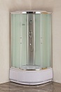 SC-1000Q — Полукруглая душевая кабина 100×100 см Просторная полукруглая душевая кабина с матовым рифлёным стеклом. Модель размером 100×100×215 см создаёт комфортное душевое пространство с полным комплектом оснащения. Конструктивные особенности: Полукруглая форма 100×100×215 см Матовое рифлёное стекло 4 мм белого цвета Хромированный алюминиевый профиль Раздвижная дверь с двумя створками Центральное расположение входа Высокий акриловый поддон белого цвета Одинарные ролики и пластиковые ручки Комплектация: Верхний душ (тропический) Душевая лейка с 1 режимом Держатель для душа Встроенное верхнее освещение Стеклянная полка Крыша Задние стенки из белого стекла Идеальное решение для создания полноценной душевой зоны с эргономичной организацией пространства.