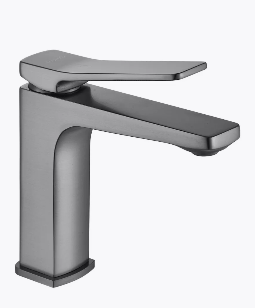 Серый смеситель для раковины из латуни. Модель S4601T монтируется на раковину через одно отверстие. Высота излива — 12.5 см, длина — 13.5 см. Производство: Китай.