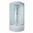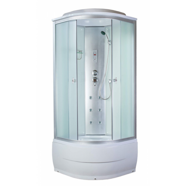 90×90×220см (матовое стекло, белые задние стенки, пульт управления: вытяжка, радио, подсветка, гидромассаж спины - 6 форсунок, полукруглый высокий поддон 40см).