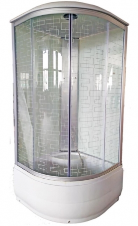 80×80×220см (прозрачное стекло с рисунком "квадраты", белые задние стенки, пульт управления: вытяжка, радио, подсветка, полукруглый высокий поддон 45см) + верхние - усиленные поворотные двойные ролики с регулировочным винтом, нижние - усиленные поворотные двойные ролики с кнопкой; нажимной сливной клапан с системой очистки (сеткой).