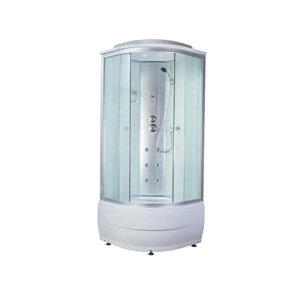 100×100×220см (матовое стекло, белые задние стенки, пульт управления: вытяжка, радио, подсветка, гидромассаж спины - 6 форсунок, полукруглый высокий поддон 45см) + верхние - усиленные поворотные двойные ролики с регулировочным винтом, нижние - усиленные поворотные двойные ролики с кнопкой; нажимной сливной клапан с системой очистки (сеткой).