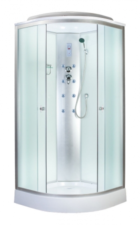 80×80×220см (матовое стекло, белые задние стенки, пульт управления: вытяжка, радио, подсветка, полукруглый низкий поддон 15см) + верхние - усиленные поворотные двойные ролики с регулировочным винтом, нижние - усиленные поворотные двойные ролики с кнопкой.