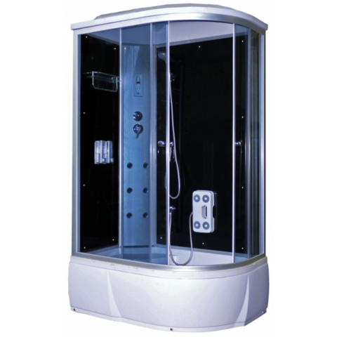 120×80×220см (серое стекло, черные задние стенки, пульт управления: вытяжка, радио, подсветка, гидромассаж спины - 6 форсунок, гидромассажер стоп, дозаторы для мыла, ассиметричный высокий поддон 40см. Левая/Правая), гидрозатвор, кнопочный слив с системой очистки, новая система сборки алюминия на защелках.