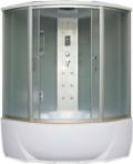 Глубокая ванна, сиденье в ванне, центральные профили, 12 форсунок, дозатор для мыла, кнопочный пульт, радио, свет, вентиляция, полка двойная, зеркало, ножной массажер, лунный свет. Гидромассаж в ванне 6 форсунок, аэро-массаж 8 форс. регулятор дозирования воздуха, сенсорная кнопка вкл/выкл 1500*1500*2200
