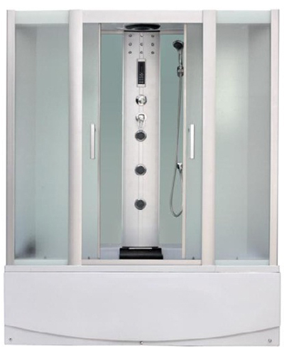 Гидромассаж спины, верхний свет и душ, вентилятор, стойка пластик хром, радио и телефон, хромированный профиль, белая стенка, дверцы - матовое стекло, кнопочный пульт,подголовник, сиденье с фикс.
