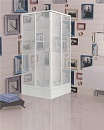 Конструкция душевой кабины состоит из четырёх сторон с угловым входом. Две стороны, прилегающие к стене неподвижные, две наружных стороны состоят из двух половин: подвижной (дверки) и неподвижной частей. Каркас рамы и каркасы элементов кабины выполнены из окрашенного алюминиевого профиля. Заполнение дверки - Стироловое стекло. Подшипник скольжения, размещенный в профиле дверок, обеспечивает бесшумное скольжение, отсутствие перекосов при движении дверок и высокую надежность всей конструкции.