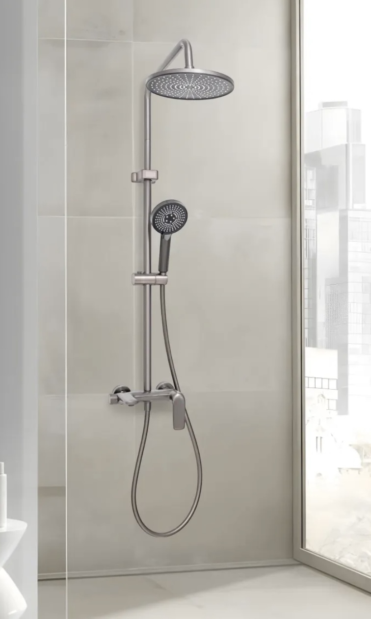Душевая система K-field KF4212 в цвете графит Современная душевая система в стильном графитовом цвете, сочетающая элегантный дизайн и расширенную функциональность. Комплект включает все необходимое для создания комфортного душевого пространства с тропическим душем. Основные характеристики: Цвет: графит, темно-серый Материал: латунь, нержавеющая сталь, ABS-пластик Управление: рычажное, с дивертором Количество режимов работы: 3 режима Длина шланга: 150 см Длина штанги: 140 см (телескопическая) Покрытие: матовое металлическое Производство: Россия Комплектация: Смеситель с керамическим картриджем (2 шт.) Душевая телескопическая штанга Тропический душ (верхняя лейка) Ручная душевая лейка Держатель настенный Шланг для лейки 150 см Комплект для установки Функциональные особенности: 3 режима подачи воды (включая гидромассаж) Встроенный аэратор Режим «тропический душ» Рычажное управление температурой и напором Дивертор для переключения между лейками Телескопическая регулируемая штанга Жесткая подводка Габариты упаковки: Длина: 70 см Ширина: 28 см Высота: 13 см Сертифицированное решение для ванной комнаты, сочетающее стиль, надёжность и многофункциональность. Идеально подходит для современных интерьеров.