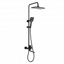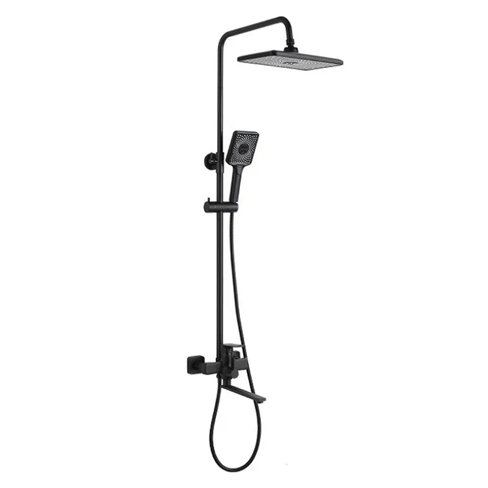 Душевая стойка с тропическим душем, серия Н71 Душевая система в матово-черном цвете с крупным прямоугольным тропическим душем. Основные характеристики: Материал корпуса: Латунь Покрытие: Матовое черное Тип: Душевая система Основной элемент: Стойка высотой 1432 мм Верхний душ: Тропический, прямоугольный, размер 300 x 190 мм Излив: Поворотный, длина 210 мм Шланг: 1.5 м Механизм: Рычажное управление, керамический картридж 35 мм Монтаж: На стену Лейка: 3 режима Дополнительно: Держатель для лейки: На стойке Термостат: Нет Форма: Квадратная Страна производства: Китай Серия: Н71