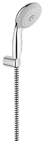 Артикул 27849000 Коллекция New Tempesta Способ монтажа вертикальный Рекомендованное минимальное давление 1 бар Гарантия производителя 5 лет Защита от перекручивания нет Вес, кг 0,69 Ручной душ New Tempesta 28 261 001: 100 мм, 3 вида струй, GROHE DreamSpray® превосходный поток воды, GROHE StarLight® хромированная поверхность с системой GROHE SpeedClean® против известковых отложений, внутренний охлаждающий канал для продолжительного срока службы, ShockProof силиконовое кольцо, предотвращающее повреждение поверхности при падении ручного душа, может использоваться с проточным водонагревателем; Держатель ручного душа без регулировки Relexa Plus 28 605 000; Душевой шланг Relexaflex 28 154 000: 1750 мм.