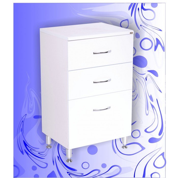Прекрасно дополнит предметы мебели и станет украшением ванной комнаты комод №2. Комод имеет три выдвижных ящика, два верхних - небольшие по объему, а нижний ящик более вместительный, что очень удобно для хранения в нём белья, полотенец, банных халатов и других необходимых предметов для ванных комнат. Шариковые направляющие выдвижных ящиков обеспечивают плавное и полное выдвижение, крепление-фиксатор предотвращает выпадение ящиков. Опорные регулируемые ножки приподнимают комод от пола, что делает удобным влажную уборку помещения.
