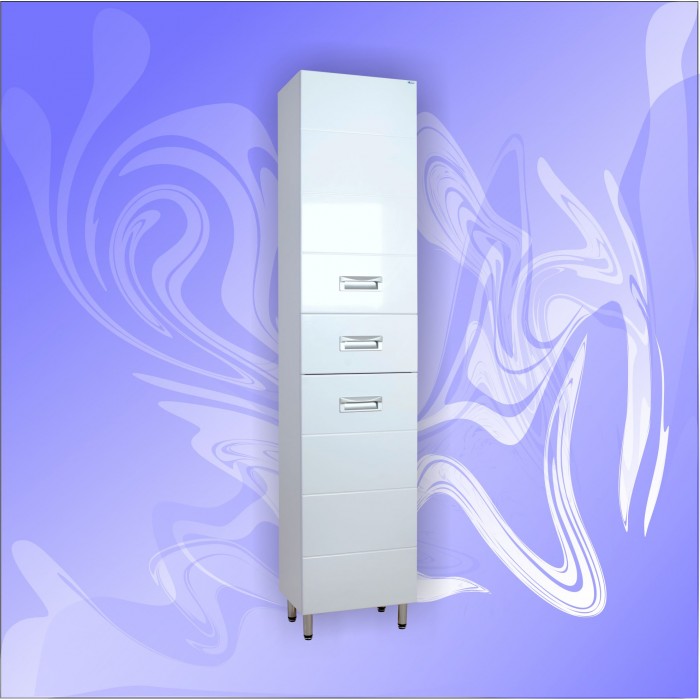 Верхний и нижний отделы фасада пенала украшены горизонтальной фрезеровкой. На белоснежном фоне выигрышно смотрятся врезные матовые ручки. Вместительные отделения шкафчиков разделены горизонтальными полочками. В середине шкафа имеется выкатной ящик для мелочей, запасных зубных щеток, ароматного мыла. Шариковые направляющие выдвижных ящиков обеспечивают плавное и полное выдвижение, крепление-фиксатор предотвращает выпадение ящиков.