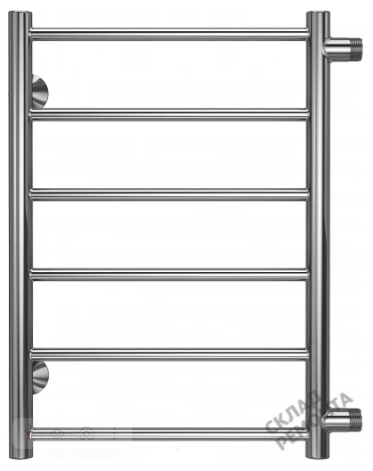 Водяной полотенцесушитель Terminus «Лесенка» Основные параметры: Форма: Лесенка (6 секций) Материал: Нержавеющая сталь Отделка: Хром Межосевое расстояние: 500 мм Ширина: 477 мм Высота: 600 мм Вес: 3.8 кг Технические характеристики и оснащение: Тип: Водяной (система отопления) Подключение: Боковое, диаметр 1" Рабочее давление: 9 атм Площадь обогрева: до 2 м²