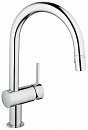 Монтаж на одно отверстие GROHE SilkMove® керамический картридж Ø 46 мм Регулировка расхода воды Поворотный трубкообразный излив Встроенная выдвижная лейка Dual С возвратной пружиной Встроенный обратный клапан Автоматический переключатель Аэратор/SpeedClean душевая струя Гибкая подводка Система быстрого монтажа С защитой от обратного потока GROHE StarLight® хромированная поверхность C-излив Радиус поворота 360° Автоматическое возвратное переключение на аэратор после выключения