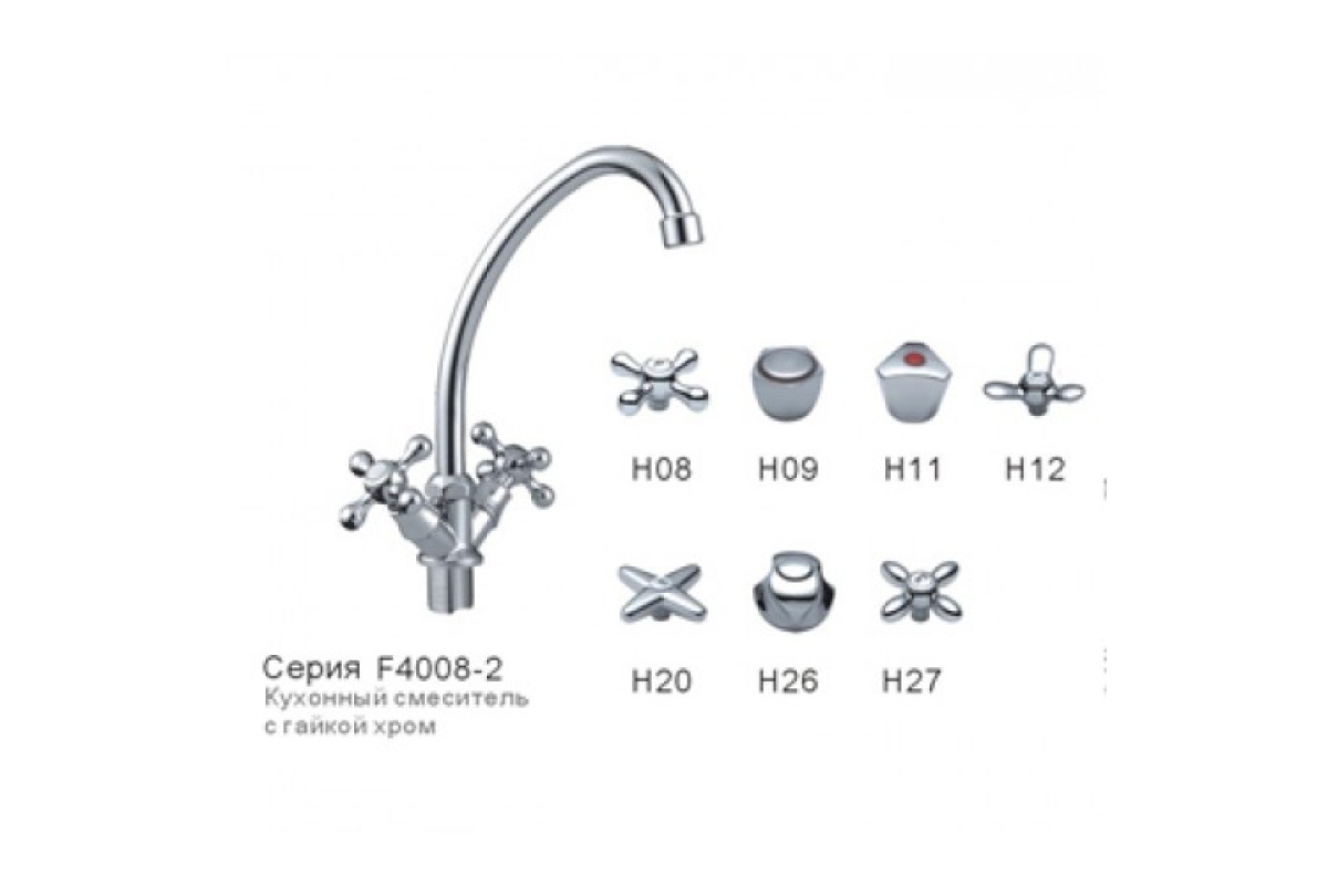 Frap смеситель для кухни, излив высокий, поворотный, двухвентильный, керамические кран-буксы, покрытие хром, крепление гайка, гибкая подводка 35 см.
