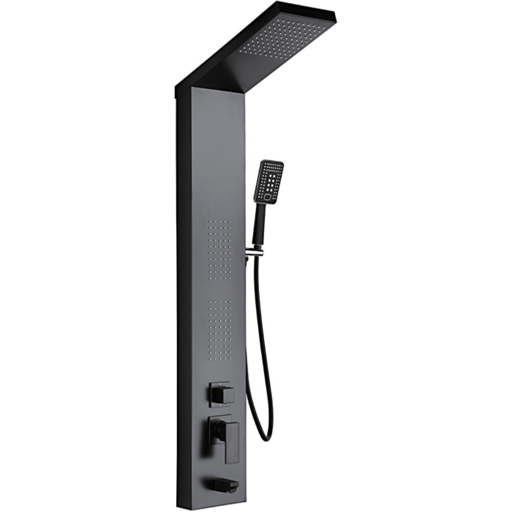 Душевая стойка с тропическим душем, серия H005 Широкая душевая система в матово-черном цвете со стационарным изливом. Основные характеристики: Материал корпуса: Нержавеющая сталь Покрытие: Матовое черное Тип: Душевая система Основной элемент: Стойка высотой 1350 мм Верхний душ: Тропический, прямоугольный, размер 450 x 200 мм Излив: Стационарный, длина 133 мм Шланг: 1.5 м Механизм: Рычажное управление, керамический картридж 35 мм Монтаж: На стену Лейка: 3 режима Дополнительно: Держатель для лейки: На стойке Термостат: Нет Форма: Квадратная Страна производства: Китай Серия: H005