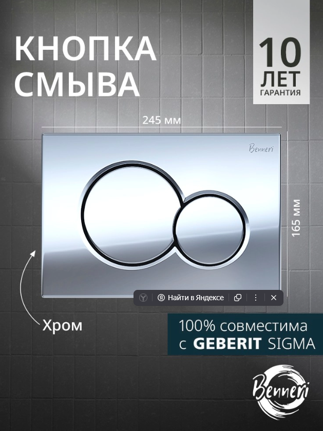 Название товара: Кнопка смыва для унитаза Mona BE.019B Описание: Современная кнопка смыва для унитаза российского бренда Benneri из коллекции Mona. Модель с круглой формой, хромированным покрытием и глянцевой поверхностью добавит элегантный акцент в интерьер ванной комнаты. Ключевые особенности: Производитель: Benneri (Россия) Коллекция: Mona Цвет: хром Поверхность: глянцевая Форма кнопок: круглая Стиль: современный Технические характеристики: Тип установки: скрытый монтаж Режим смыва: двухрежимный Управление: механическое Назначение: для унитаза Область применения: бытовая Габариты: Ширина: 245 мм Высота: 165 мм Глубина: 12 мм Вес: 0,3 кг Комплектация: Кнопка Крепления Инструкция